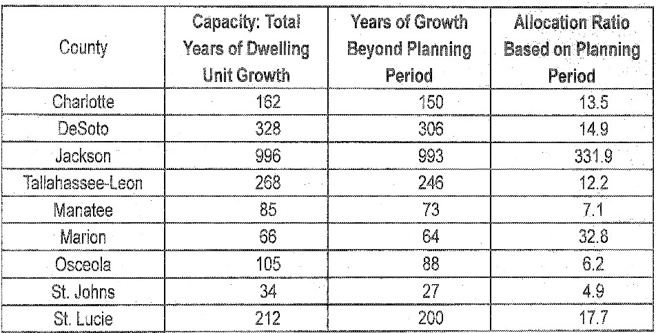 That table at the top of the story with the projected residential capacity for nine counties is from the Florida Department of Community Affairs presentation by Tom Pelham. I called the planning departments in DeSoto, Jackson and Leon County for responses.